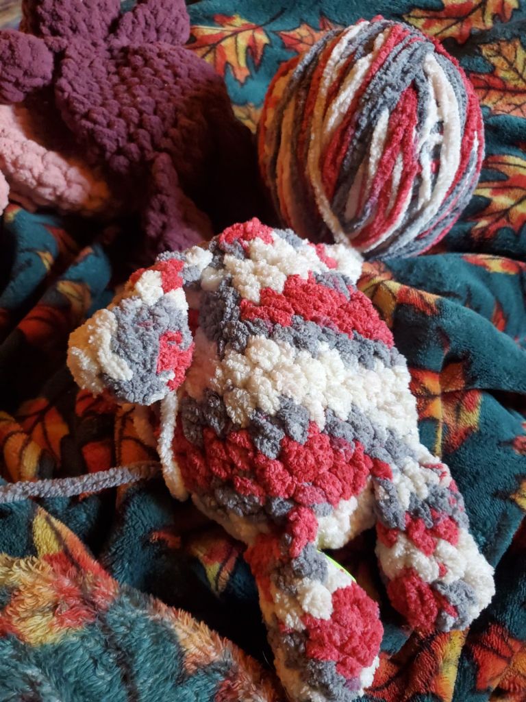 I was going through my yarn after finishing Randy, attempting to gather it all into a tote and away from our living space, when I came across some unfinished snugglers. The pink and purple bears just need eyes while the red, grey, and white bear is still missing a head. After that I found some Piglets and Pooh Bear swings that are missing their swings.